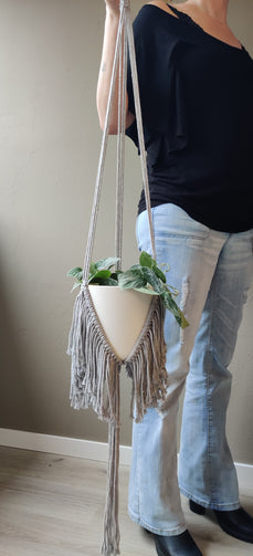 Geef je plant een kek rokje met deze handgeknoopte hanger. Inclusief witte pot en metalen ring, dus klaar om je leukste plant op te hangen. De pot is in Nederland gemaakt van gerecycled plastic met eigen windenergie en is 100% recyclebaar. Ook is de pot waterdicht.